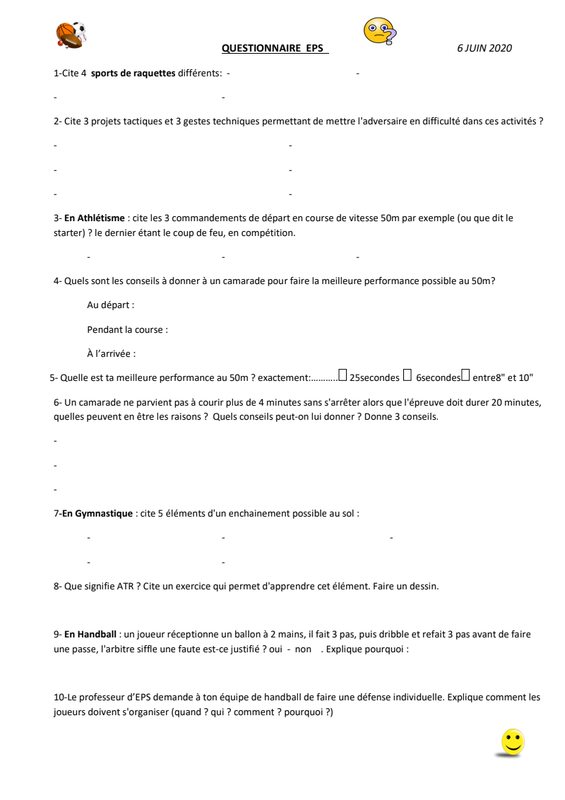 Ce questionnaire est à renvoyer pour le 16 Juin , par mail sur l'ENT. Il servira comme dans les autres matières à apprécier la qualité et vos capacités de suivi du travail à distance pour le conseil de classe.