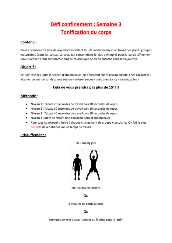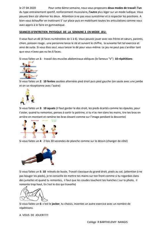 nous voilà repartis pour encore quelques jours ou plus...alors voici pour cette semaine 6 un échauffement joué et des exercices d'étirements à pratiquer seul ou en famille. Lisez bien les consignes et c'est parti !!!