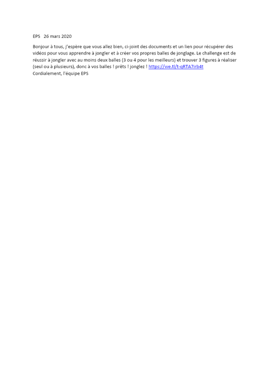 Pour cette nouvelle semaine, nous vous proposons un nouveau défi. Nous vous proposons d'apprendre le flashmob qui se trouve en lien ci-dessous. C'est une chorégraphie créée par un groupe de professeurs d'EPS français répartis sur tout le globe, ce flashmob sera donc réalisé dans de nombreux collèges et lycées français en France mais aussi à l'étranger lorsque tous les élèves pourront reprendre le chemin de l'école normalement. L'idée pour nous serait de le réaliser un mercredi après midi sur la base du volontariat (tout les acteurs du collège sont invités à y participer), la date de l'évènement dépendra évidemment de l'évolution des conditions sanitaire. Mais une chose est certaine, c'est que vous avez le temps de répéter ce flashmob est de l'apprendre !